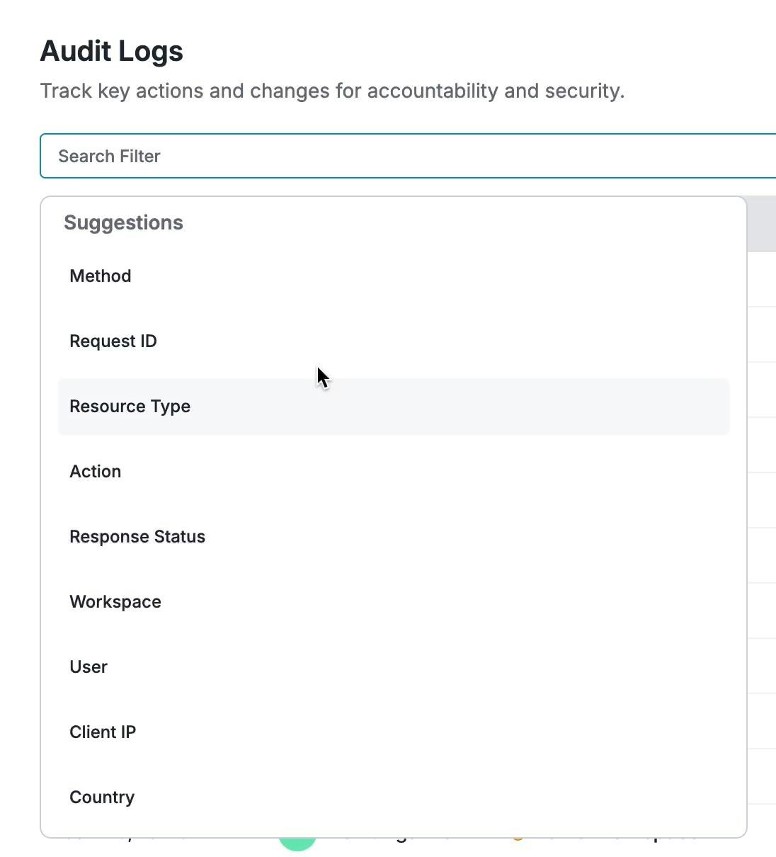 Portkey provides powerful filtering options to help you find specific audit events quickly: